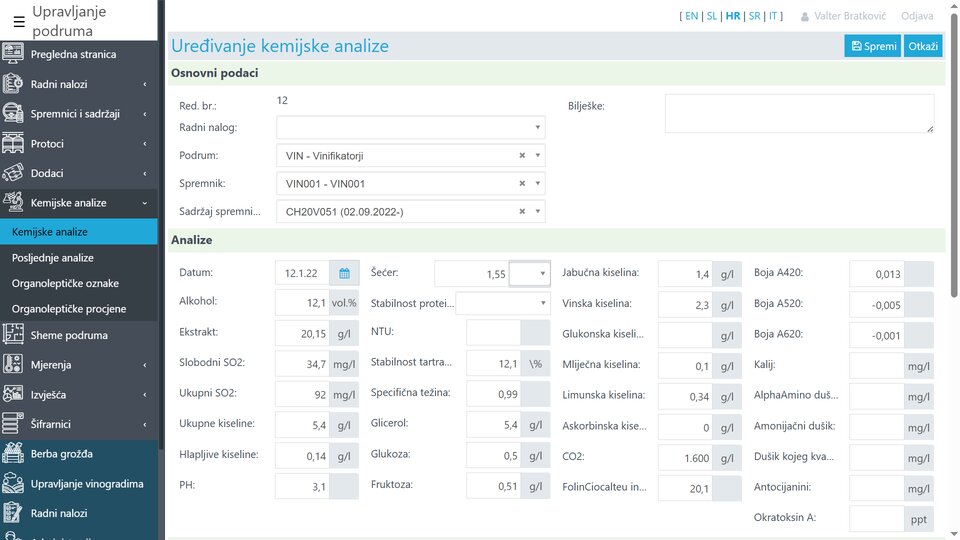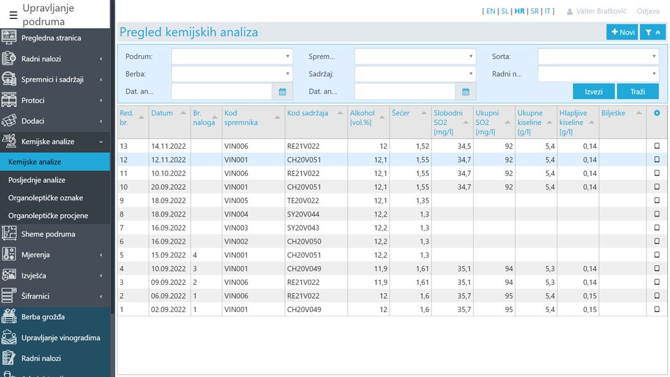 Izrada nove kemijske analize. Moguć je i unos kemijskih analiza s laboratorijskih uređaja (npr. WineScan-a).