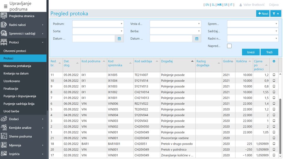 Protocima sadržaja se bilježe sva kretanja sadržaja među spremnicima u vinariji, poput punjenja, dopunjavanja, pretakanja, pražnjenja, izlaska iz podruma itd. U slučaju povezivanja s knjigovodstvenom aplikacijom za svaki događaj izradit će se odgovarajući ulazni i izlazni registar.