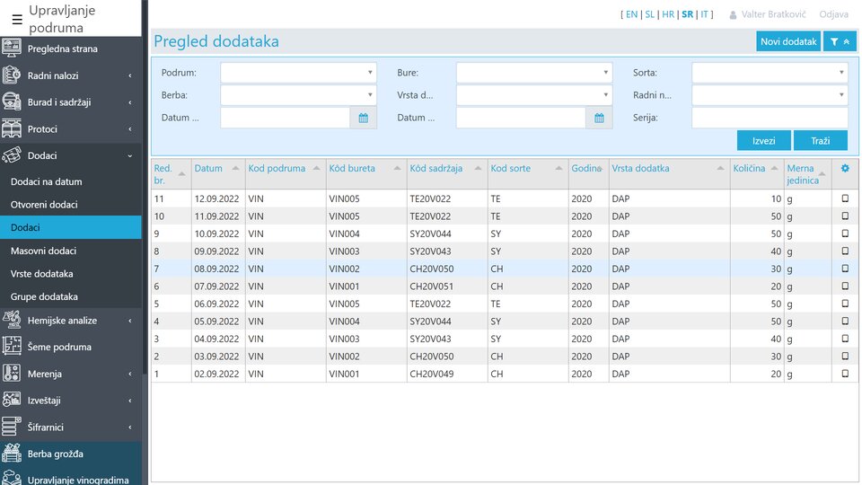 Jednostavan način beleženja svih dodatih enoloških sredstava u sadržaju svakog bureta i pregled prema različitim kriterijumima. U slučaju povezivanja sa ERP-om automatski se kreiraju podaci o primljenom i izdatom korišćenom materijalu, a istovremeno se povećava vrednost/cena sadržaja.