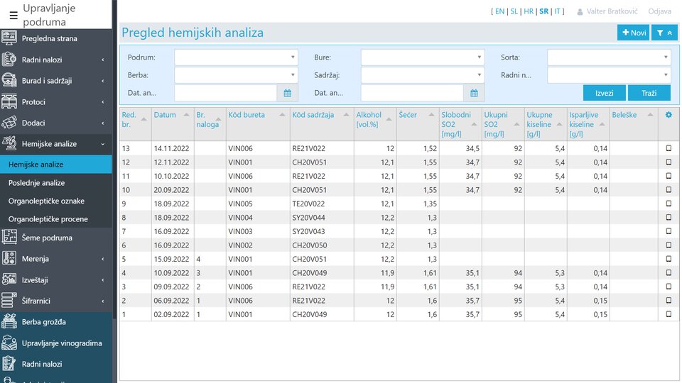 Hemijske analize se mogu zabeležiti za svaki sadržaj bureta. Na raspolaganju je i povezivanje sa laboratorijskom opremom za prikupljanje podataka (WineScan). Aplikacija vam omogućava praćenje više od 30 različitih hemijskih analiza.