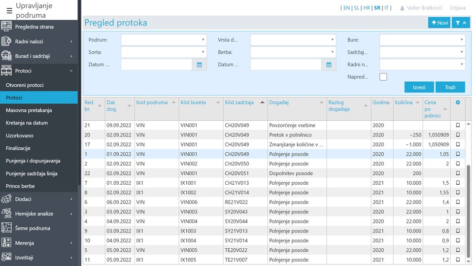 Protoci sadržaja beleže sva kretanja sadržaja među buradi u vinariji, kao što su punjenje, dopunjavanje, presipanje, pražnjenje, izlazak iz podruma itd. U slučaju povezivanja sa računovodstvenom aplikacijom, za svaki događaj biće kreiran odgovarajući ulazni i izlazni registar.